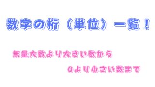 生活 数字の桁(単位)一覧!無量大数より大きい数から0より小さい数まで 数字の桁(単位)の読み方は、「一、十、百、千、万、億、兆」などがよく知られています。近年ではコンピュータの普及により、「兆」よりも大きな数の「京(けい)」や「垓(がい)」といった桁がメディアやインターネット上で時折見られるようになりました。... 生活